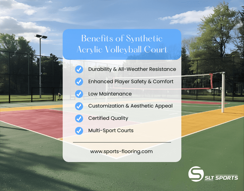 Synthetic acrylic volleyball courts deliver durability, weather resistance and consistent play, making them the best choice for schools, clubs and academies. Top benefits of synthetic acrylic volleyball court are:-